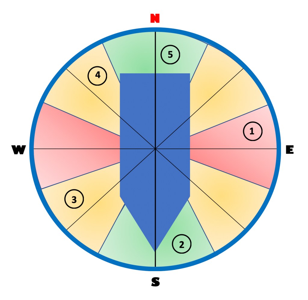There is some good news though. The Queen’s Harbour Master team in Portsmouth are as capable of controlling warship movements as any team in the world. The tugs procured specifically for moving QE around are extremely powerful and well handled. Also, the wind limits will have been made into a science by now (see diagram). Clearly a wind on the beam is worst case (1). From dead ahead (in this case from the South) within reason, is fine (2). Wind on the bow, such as a sou’westerly, will have some effect but not as much (3). Same as a wind on the quarter (4). Wind from dead astern, less still (5). All this will have been calculated and clear limits articulated, i.e. 25 kts from the east: out of limits, 20 knots from the southwest: just in limits etc.