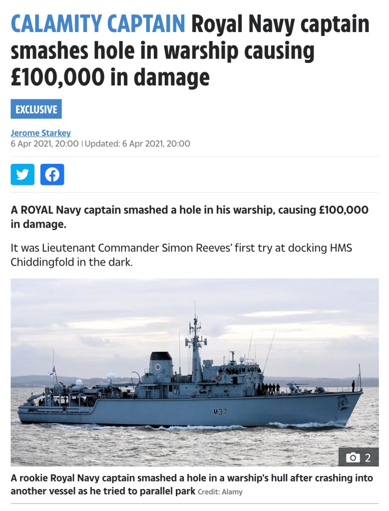 HMS Dulverton, a Hunt Class minehunter of the same type mentioned in the Sun story above, was in theory an easy ship to handle. In practice, often less so. Two propellors and a bow thruster gave you lots of options but you needed them as you were inevitably asked to squeeze into tight spots and tugs were rarely available. There were other difficulties. For a start, they may be the best sailing vessel the navy has ever produced. Slab sided above the water but rounded and shallow below meant that any more than six knots of wind on the beam and you had to adjust your approach. Failure to do so could result in one coming alongside some distance short of your allocated berth. This is unfortunate if there is a ship already there as I discovered one windy day up in Faslane. The good news back then was that when this sort of thing happened, the ship’s company’s priority was repairing the paintwork, not ringing a national newspaper… The shape of the propellors meant that reducing headway took a while. Conversely, at slow speeds, a combination of the prop design and the minimum speed you could set on the engines meant you leapt down the jetty like you were on fire (which given the Deltic Diesels back then, you quite often were). Finally, as HMS Chiddingfold discovered, although the GRP hull was designed to absorb a mine detonation that is a load shared along the length of the ship; its ability to absorb point impact is very poor. You could do some neat tricks such as walking the ship bodily sideways, but for me at least, the fragility of the hull took much of the fun out of driving one.